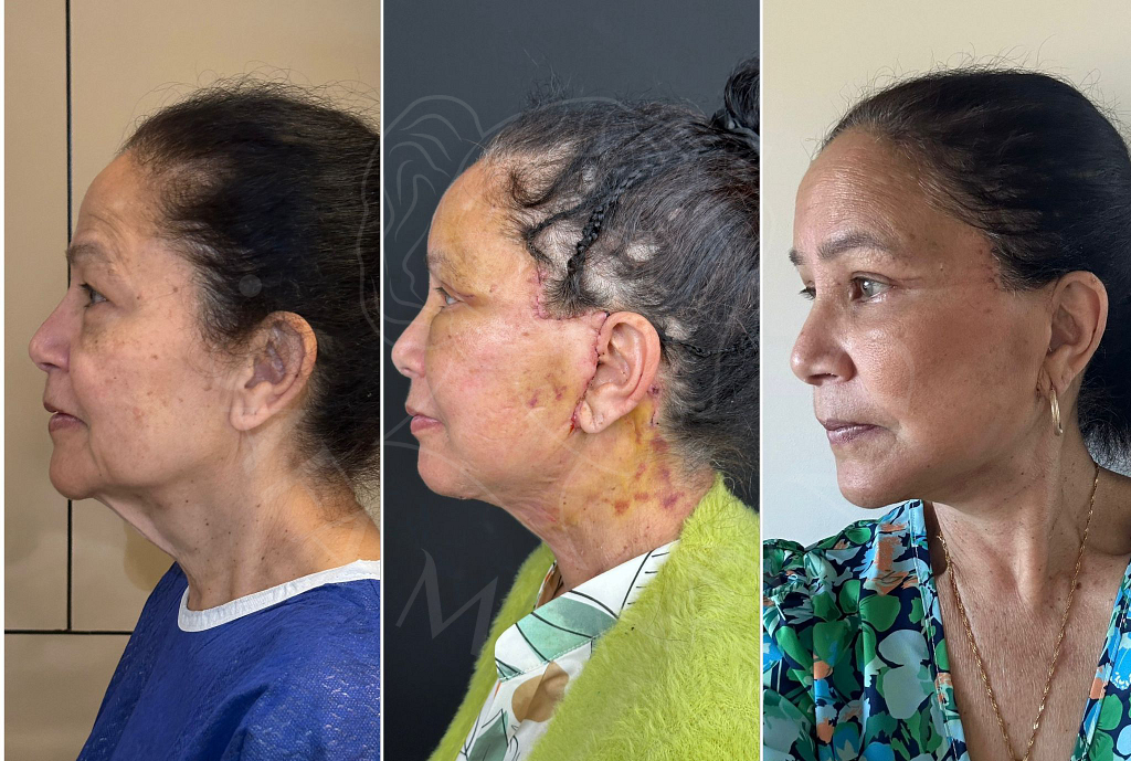 The healing process varies from patient to patient, and we strive to be transparent about what to expect. Below, you can see the healing timelines of two patients following a facelift operation. Please note that the healing period depends on factors such as the type of procedure, the patient’s age, and individual characteristics.